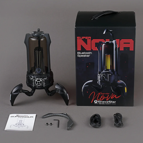 The Supernova fuses a high-fidelity speaker system with a classic lantern design on a futuristic mecha walker base. Carry it with you on the go or around the house, then deploy its 3 foldable legs for solid support on any surface.